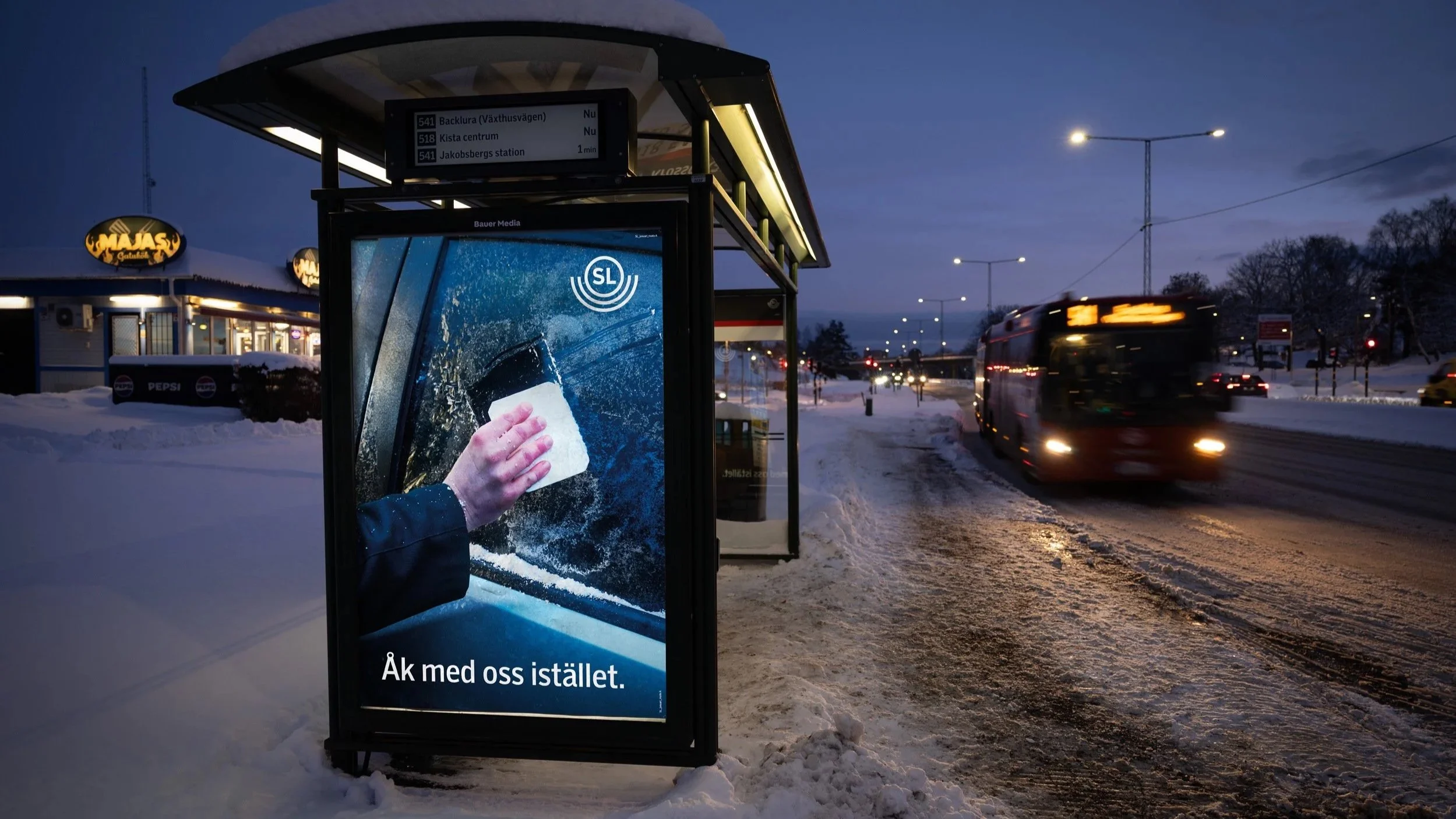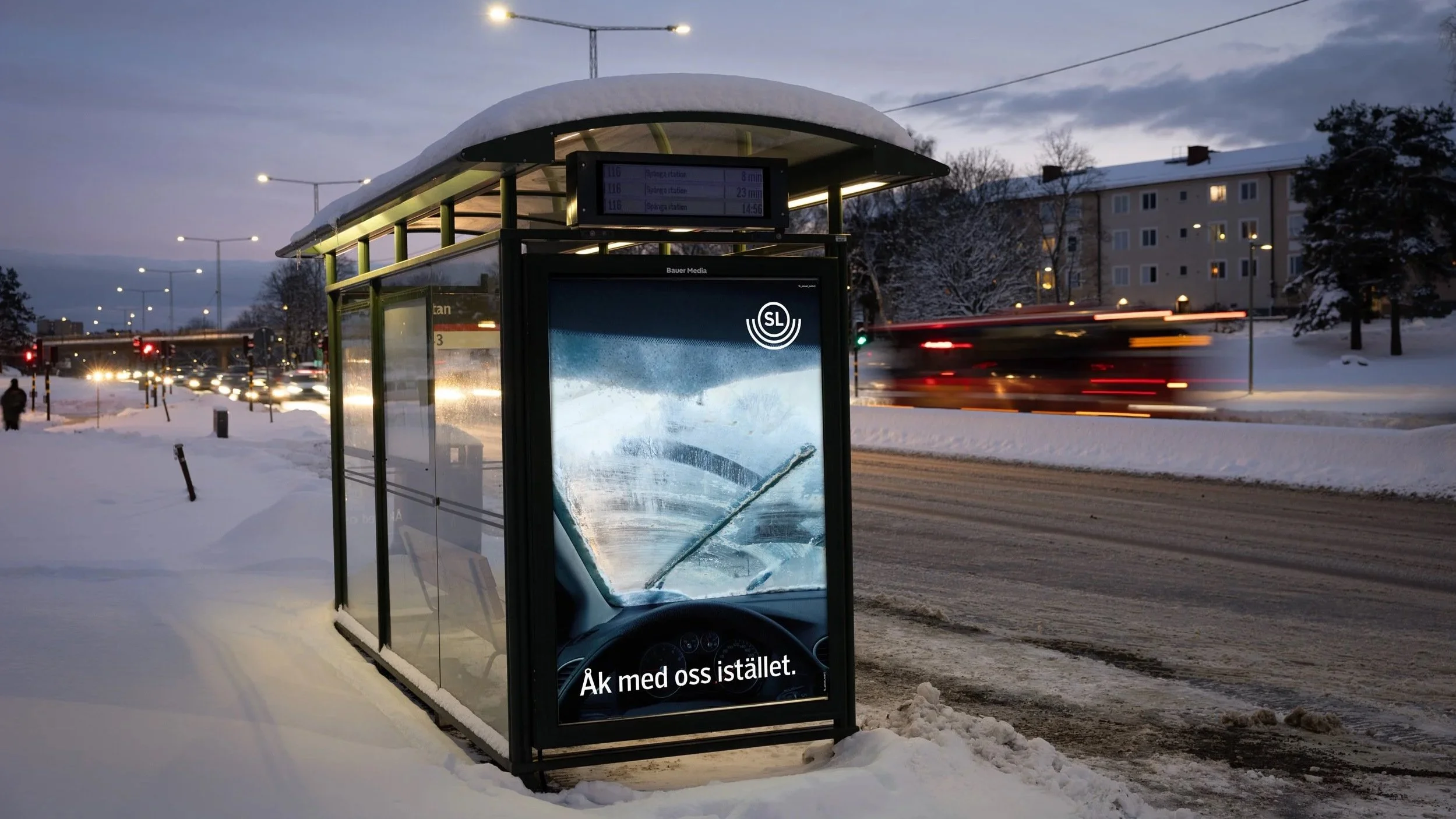 Sedan 2022 har SL:s reklam uppmanat både bilister och invånare i regionen att välja kollektivtrafiken framför bilen. För första gången gestaltades detta i en kylig vinterkontext, när kampanjen lanserades under det första snöfallet i mellandagarna 2025.